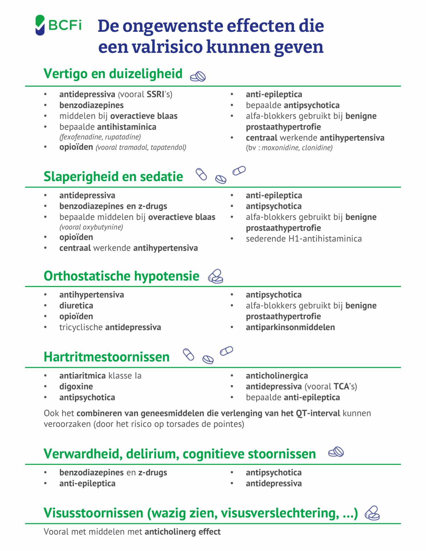In de e-learning ‘Geneesmiddelen en valrisico‘ leer je de geneesmiddelen en ongewenste effecten herkennen die een val kunnen veroorzaken. Je kan de samenvatting hier terugvinden en downloaden: